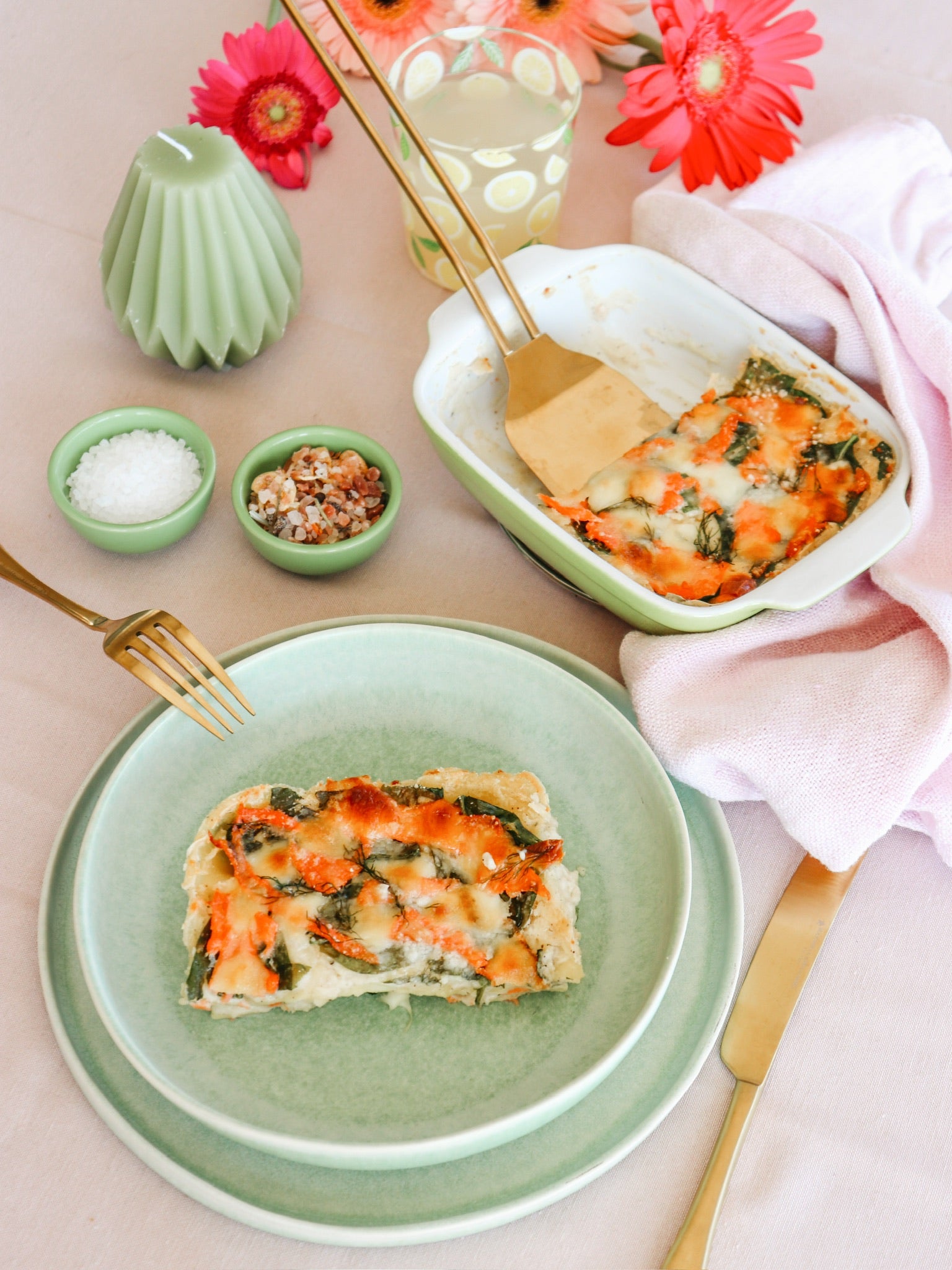 Ingredienti: burro, farina, latte vaccino, pasta fresca all'uovo, Grana Padano, noce moscata, sale, pepe, mozzarella, aneto, salmone affumicato, spinaci novelli